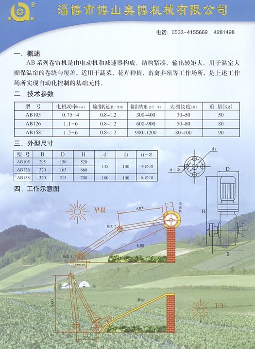 AB系列大棚卷簾減速機(jī)是由電動(dòng)機(jī)、擺線針輪、蝸桿蝸輪直聯(lián)一體的新型產(chǎn)品。目前我廠投入批量生產(chǎn)的有AB853、AB104、AB105、AB126、AB158型五種,匹配功率從0。04kw-4kw不等。輸出轉(zhuǎn)速范圍從0. 3轉(zhuǎn)/分-100轉(zhuǎn)/分任意選擇,主要適應(yīng)各種大棚卷簾,以及航車,倉(cāng)庫(kù)開(kāi)窗之用。