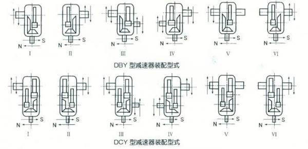 減速器按出軸形式可分為Ⅰ、Ⅱ、Ⅲ、Ⅳ、Ⅴ、Ⅵ六種裝配型式,按旋轉(zhuǎn)方向可分順時針(S)和逆時針(N)兩種方向,Ⅲ、Ⅳ、Ⅴ、Ⅵ型可裝制動或逆制裝置。如圖。